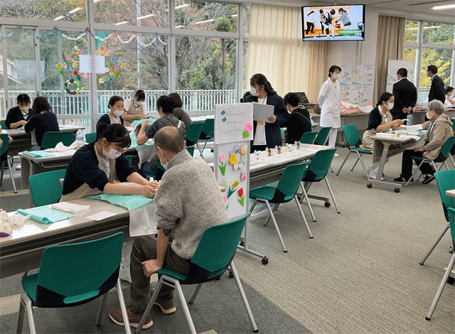 講演後には、神奈川県住宅供給公社や若葉台まちづくりセンター、シニアライフ振興財団、横浜旭中央総合病院の皆様のご協力により、骨密度測定やアロマハンドマッサージ、住まいの相談など、多彩なコーナーを実施しました。多くの方が足を止め、自身の健康を振り返るきっかけとして活用されていました。